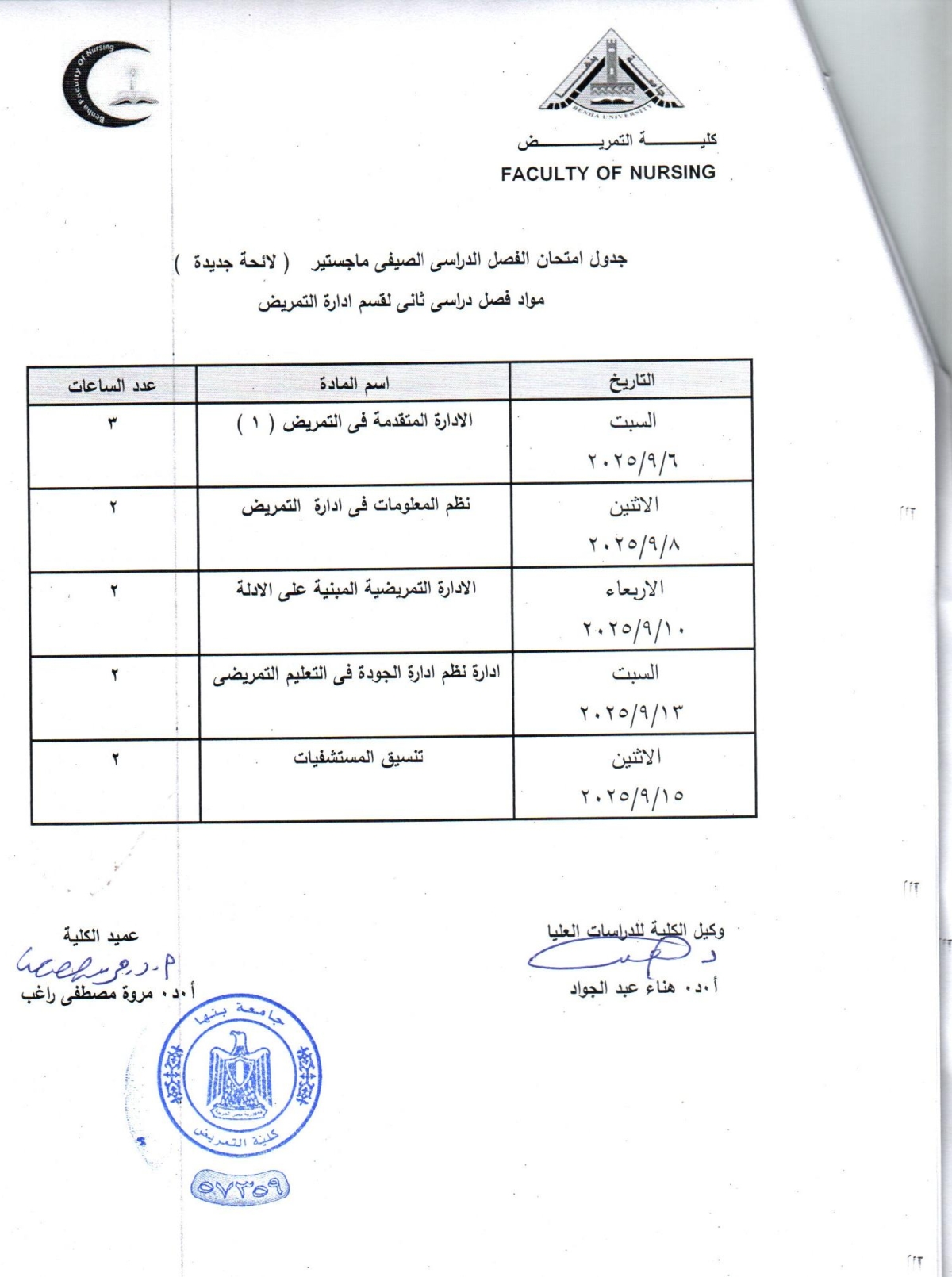 جدول امتحان الفصل الدراسى الصيفى ماجستير لائحة جديدة فصل دراسى ثانى لقسم ادارة التمريض